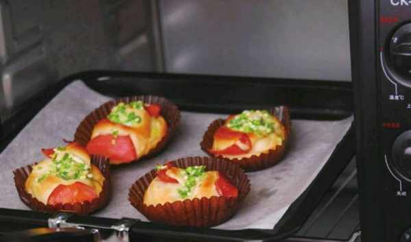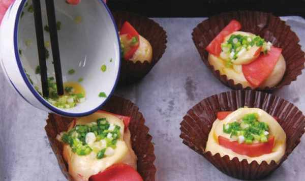 ,進行最後一次發酵。4.將發酵好的面包放入烤盤中,表面刷上一層雞蛋液,撒上鹽和蔥末(圖5)。