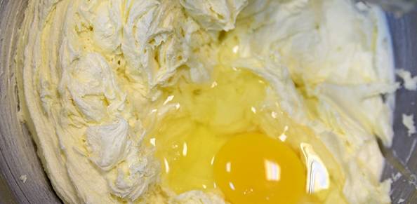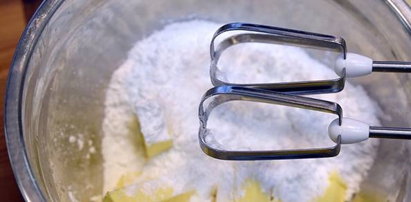 1.黃油切塊軟化,與糖粉、鹽一並倒置攪拌器皿內,快速攪拌至顏色淺黃;