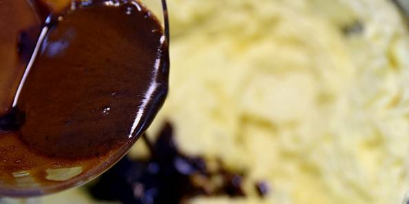 4.咖啡醬微微置涼,倒入攪拌的黃油醬中;