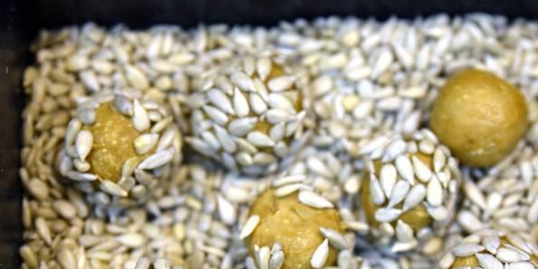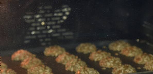 8.揉好的小面團放入瓜子仁中,晃動使之四周沾滿瓜子仁,擺入烤盤;