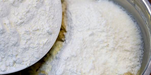 5.低筋面粉、奶粉、蘇打粉和椰蓉一起加入,手動攪拌至無幹粉;