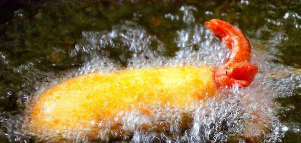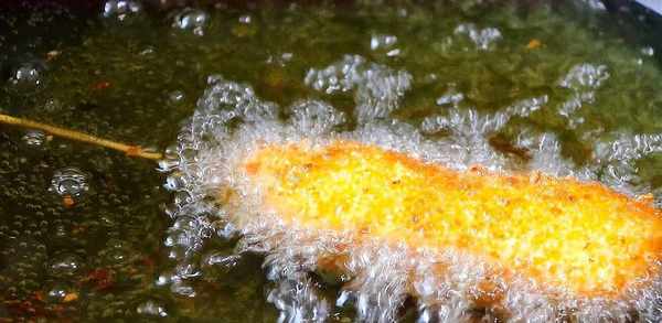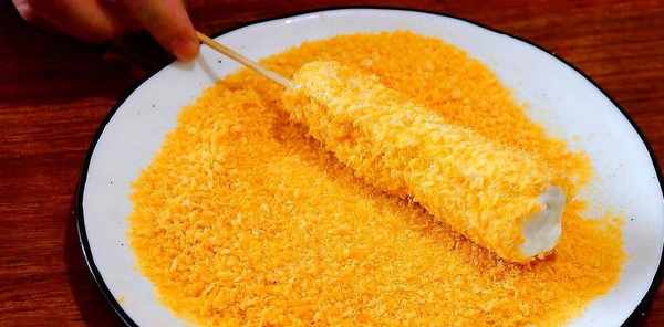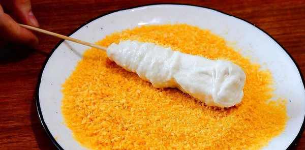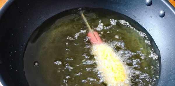 裹好面糊後,再滾上一層面包糠,放入油鍋中炸制。(測下油溫,筷子放入油鍋內,能夠起泡泡,就可以放入芝士熱狗棒炸制瞭。)