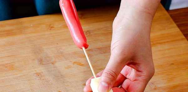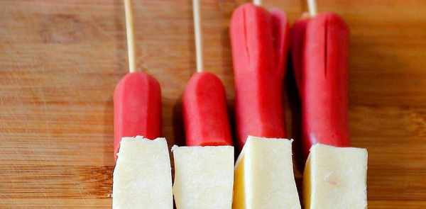 竹簽上先串上烤腸,再串上切好的芝士塊。