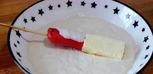 把芝士烤腸裹上一層面糊,盡量把芝士都裹在面糊裡面,不要露在外面。(如果是有打上十字花刀的烤腸,下端開花部位就不要裹面糊。)