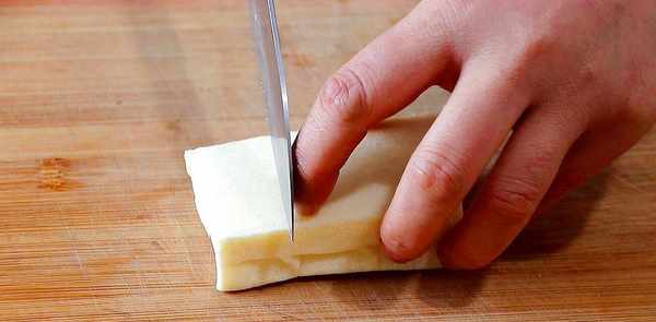 芝士塊切成小塊。(如果您用的是碎芝士,可以把碎芝士放入碗中,隔水化開後圈在竹簽上端。)