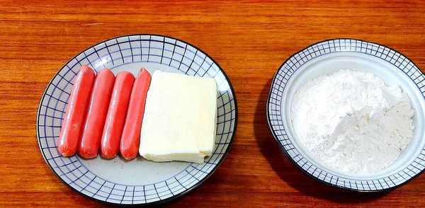 烤腸,芝士塊,面包糠,面粉,酵母,番茄醬,沙拉醬,油,水。