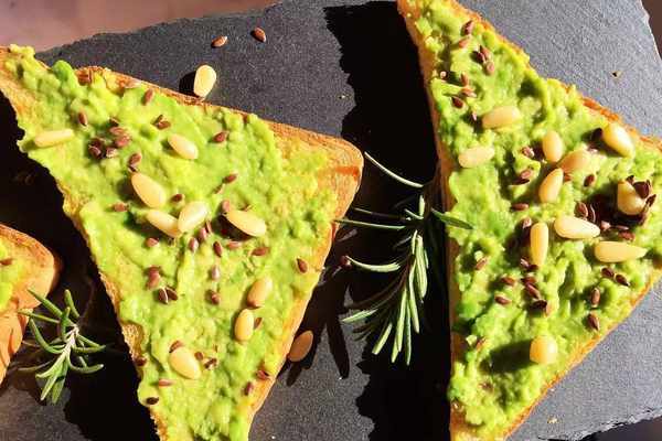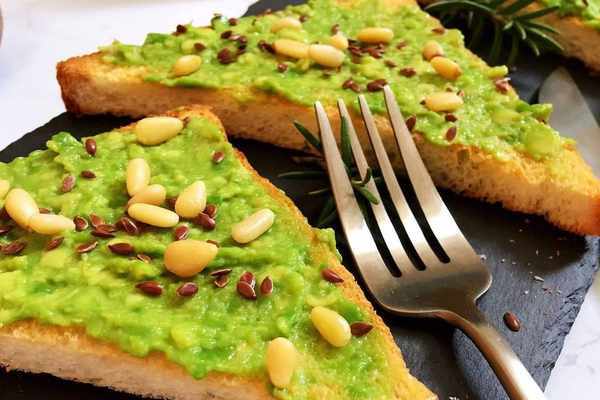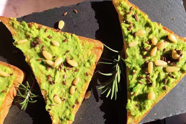 第五步:牛油果塗在面包片上,上面撒上亞麻籽和松子仁即可,這道綠油油的早餐,10分鐘上桌,一看心情就倍兒好,關鍵是營養健康還好吃,陽光下,享受這道享受這道美味吧!