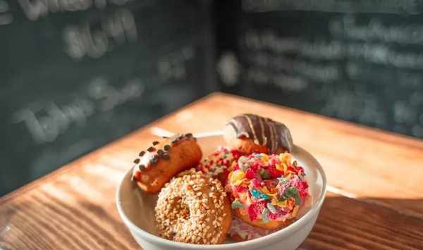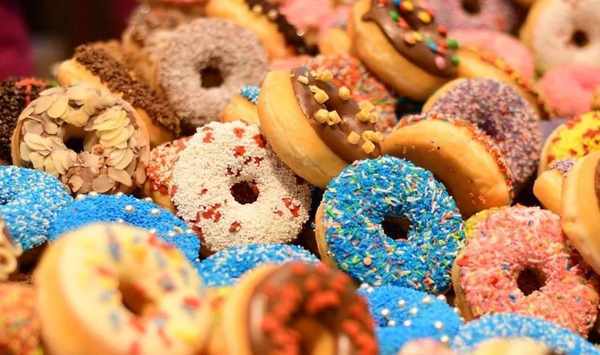 7.把二次醒發的甜甜圈放在油鍋裡炸下,撈出來就可以沾上各種醬料,撒上彩虹粒,就可以吃啦!