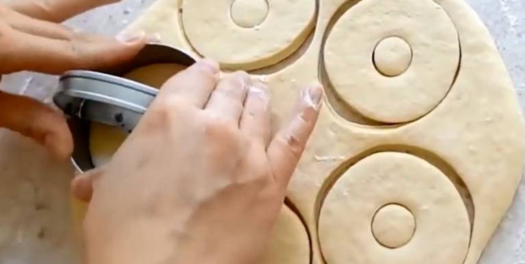 4.取出面團,搟成面片,用專用的小工具按壓一下,甜甜圈這就成型啦;