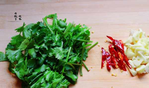 2.準備香菜段、辣椒、蒜末。(喜歡吃辣就用小米辣椒)