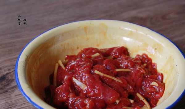 1.牛肉切成薄片或切成細絲都可以,我切的是薄片,牛肉切片有訣竅,不要順著牛肉的紋理切,要橫切牛肉,這樣做牛肉吃起來一點都不塞牙。