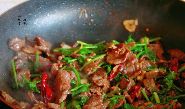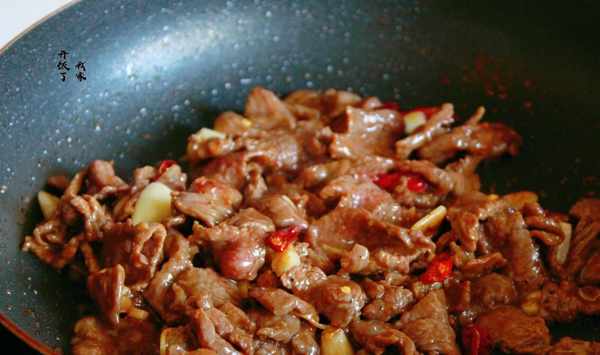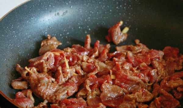 3.油溫5成熱就可放牛肉進行煸炒。