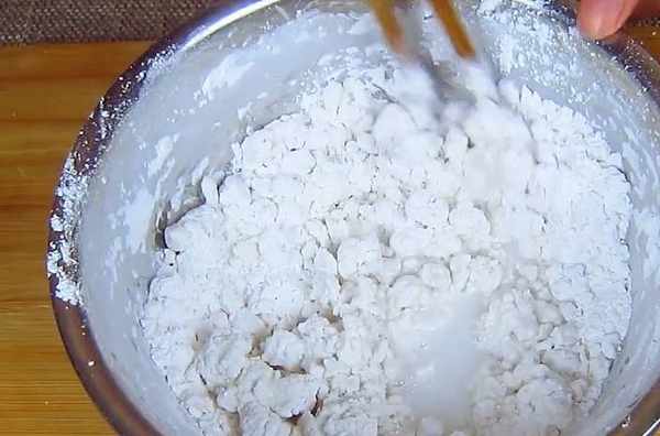 第一步:將澄粉倒入適量的開水燙熟,用筷子攪勻,放入盆中備用。
