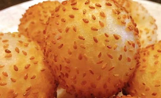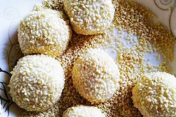 第三步:取適量的面團揉成圓形,放入白芝麻中滾幾圈,均勻的沾上白芝麻。再用手捏一下,把芝麻壓實,防止炸至過程中脫落。