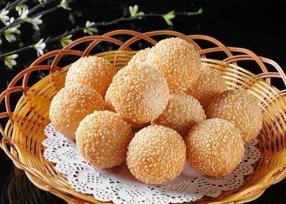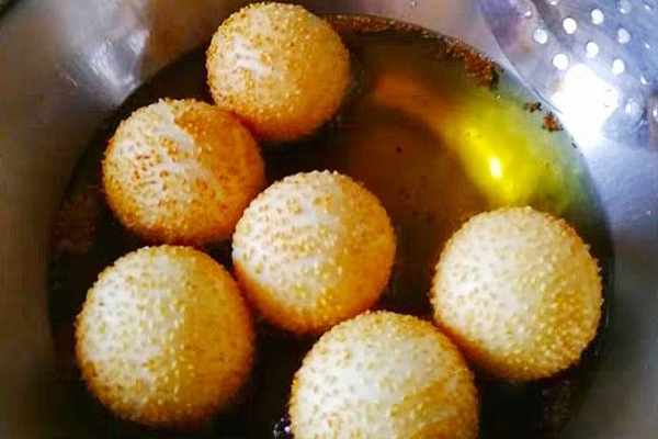 第三訣竅:炸至麻球的過程中,要用漏勺不斷地給麻球均勻的按壓排氣,才能做得又大又圓,而且還不開裂。炸制過程一定要用小火,新手用大火就會容易炸糊,就不會好看瞭。