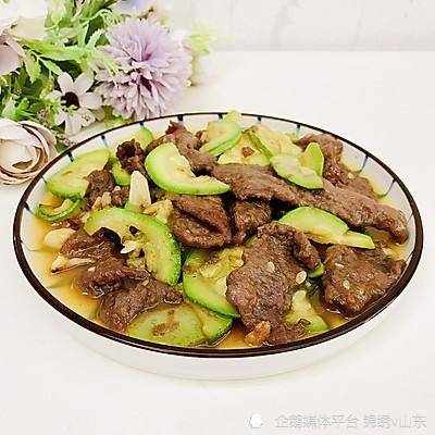 2.清洗幹凈西葫蘆和口蘑,然後切成薄片備用,接著熱鍋燒油,油熱以後,放入醃制好的牛肉煸炒,炒至變色後,盛出備用。