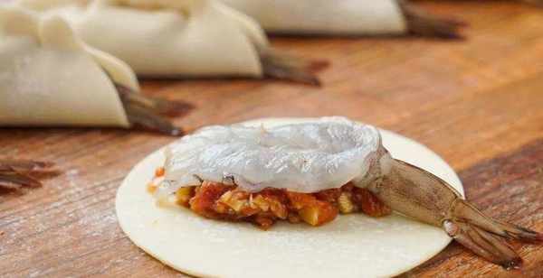 第三步,有幾隻蝦就需要準備多少張餃子皮,餃子皮鋪開,放入少許肉餡,在放一個蝦仁,蝦的尾巴留在餃子皮的外面,然後將餃子皮捏合上,捏出點紋路來。