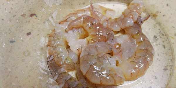 第二步,活蝦去殼,去蝦線,尾巴留著(第一次做的時候,我將尾巴也給剝去瞭),帶尾巴包出來的餃子很有藝術感,蝦仁清洗,加入料酒、蔥薑末、鹽醃制一小會。醃制的過程中,準備一個小碗,加入適量淀粉,加入水,攪拌成淀粉水備用。