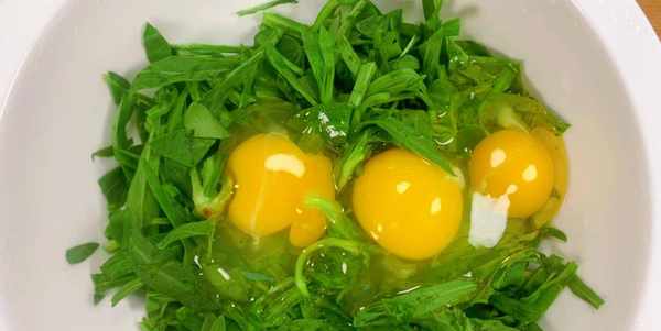 2、切碎的面條菜裝入小盆內,裡面打入3個雞蛋,再放入切好的香蔥段和大蒜粒,加入1勺蠔油、少許的鹽和胡椒粉,把它迅速的用筷子攪拌在一起。起鍋燒油,油溫不高倒入雞蛋液,轉成中小火,用鏟子把雞蛋液攤平,雞蛋液完全煎至定型後,再用鏟子把它翻炒,最後炒至雞蛋兩面金黃關火,盛出來就可以。