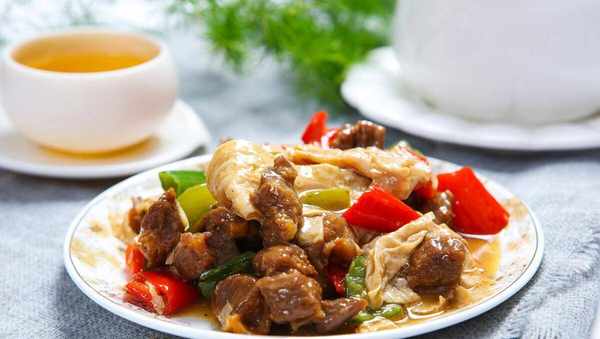 2.鍋內菜油燒至七成熱,下腐竹條炸一下撈起,切不可炸太久。倒去餘油留50克,放入肉片炒散籽,再下薑、蔥、腐竹、鮮湯200克、泡辣椒、味精、鹽、醬油,加蓋燜約3分鐘,淋入水豆粉20克,待汁濃亮油時,再加入麻油,起鍋入盤即成。