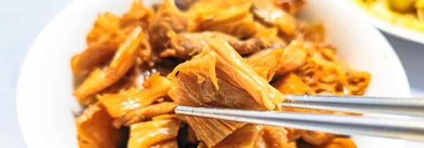 腐竹又名豆棒,豆桿,是豆腐類的脫水制品,在幹燥的環境條件下,可長期存放,形像短棒或竹節故名。腐竹燜肉,具有營養豐富,色澤棕紅,油而不膩,鮮咸適口。