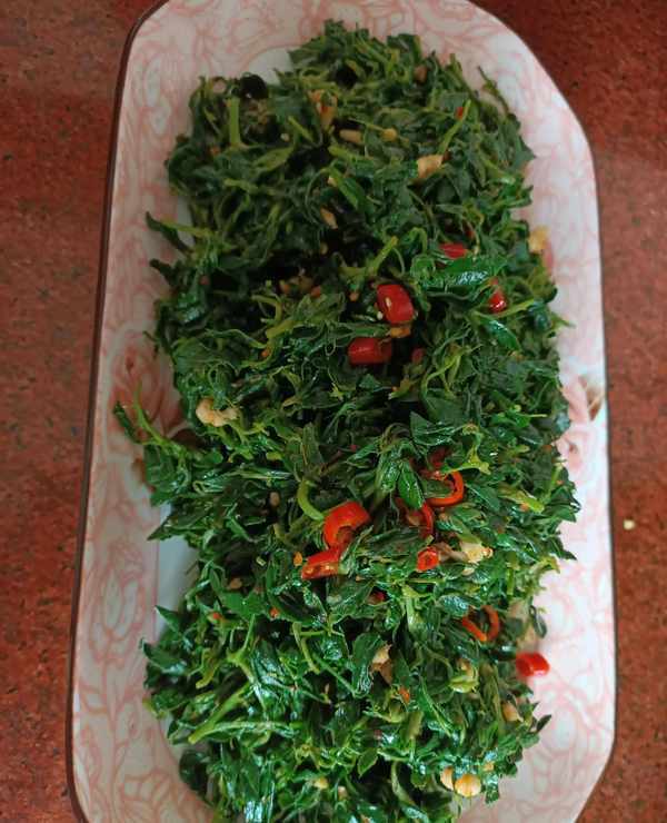 這是涼拌的苜蓿菜,苜蓿焯水3-5分鐘,看個人口感,撈出過涼水,然後捏幹水分。配料是蒜末小尖椒辣椒面(放好澆熱油),再加醋花椒油味極鮮,拌勻,超好吃!