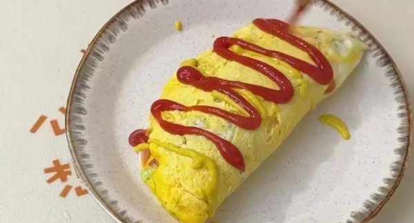 第四步取出後,把它對折起來,去掉保鮮膜,然後在蛋卷上撒上沙拉醬和番茄醬,就可以啦~