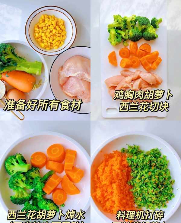 2.將西蘭花、胡蘿卜焯水煮熟,(如果玉米是生的也要煮一下)分別用料理機打碎。