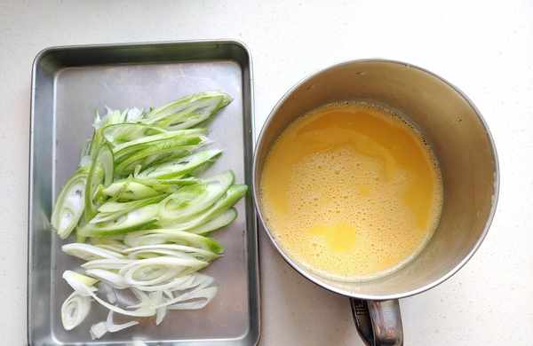 2、大蔥洗凈斜著切成蔥花,雞蛋打散加料酒攪勻待用。