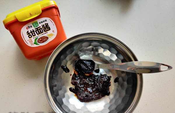 3、提前調一碗醬汁,碗中放一大勺豆瓣醬、一勺甜面醬、3克白糖、2勺清水攪勻待用。