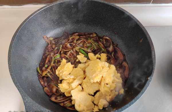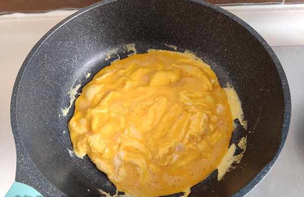 雞蛋不要炒太久,也不要用鏟子切成小塊,雞蛋放醬汁裡顛幾下鍋也會散開。