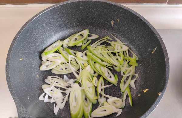 5、鍋中再次放植物油,放入蔥花炒出香味。