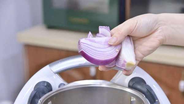 1.將250g切塊洋蔥、3支紅辣椒、50g紅甜椒放入主鍋中,以30秒/速度5切碎,再用刮刀將鍋壁食材刮到鍋底部;
