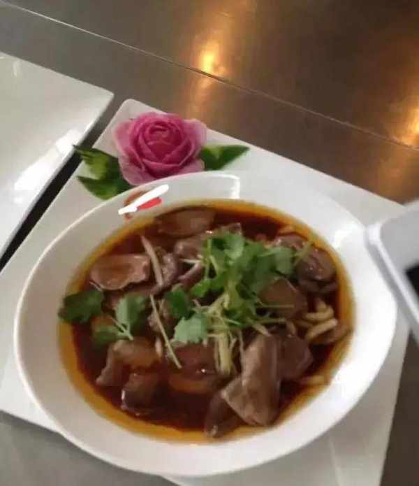 3,碗中倒入蒸魚豉油,美極鮮,糖,味精,加水攪拌淋入腰花上面擺上京蔥絲紅椒絲淋熱油香油。