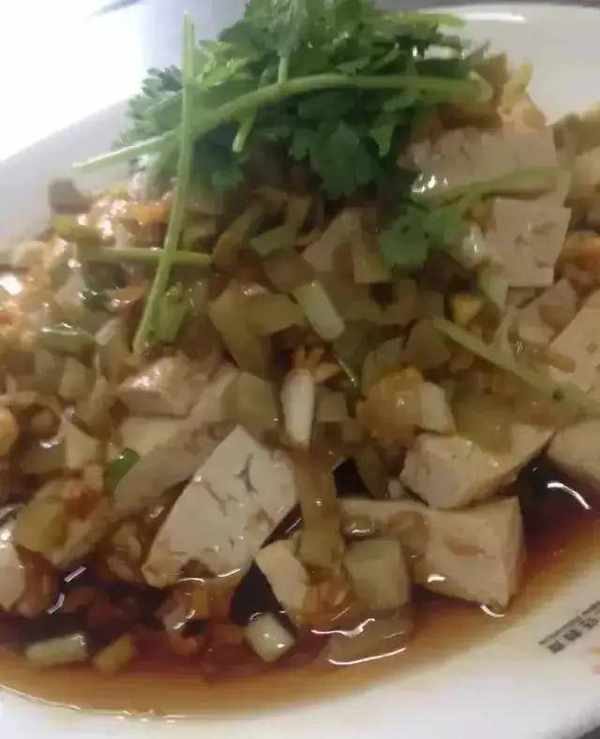 2,豆腐皮切菱形片,上海青撕片,蒜子切成沫,和豆腐一起拌調鹽,糖,味精,芝麻油,紅油,拌均即可