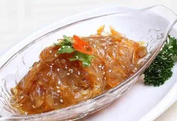 3,海蜇晾幹水分裝碗加薑絲,白醋,生抽,味精糖,蔥油拌好放入胡蘿卜絲攪拌