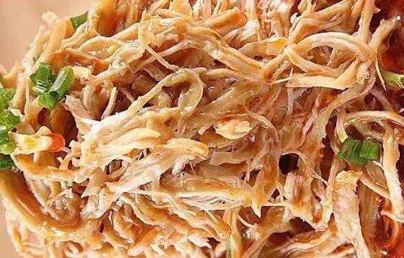 2,鍋入水放入花椒,八角,蔥結,料酒,薑片,水開下入雞脯肉,小火慢燉至熟爛,冷水沖涼撕成絲。