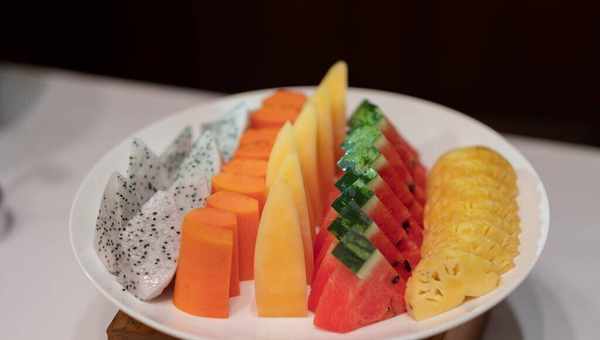 1.將西瓜在4/5處切開,掏出瓜瓤,去子切成小塊;蘋果、菠蘿、梨、桃、櫻桃、桂圓均切成小塊。