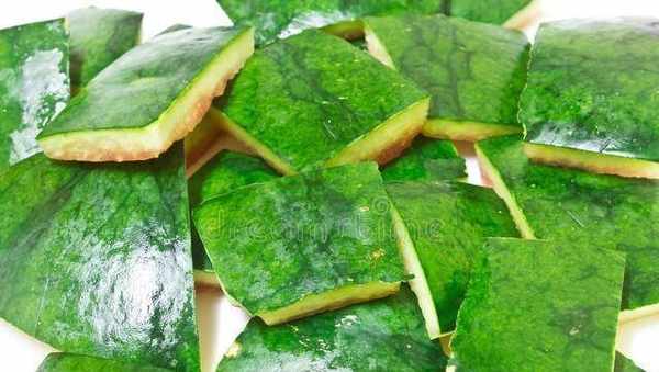1.將西瓜皮削去外層薄皮,用冷水洗凈,切成1厘米見方的丁;青椒去掉蒂、籽,洗凈切成與西瓜皮同樣大小的丁;毛豆用開水燙熟控凈水分。