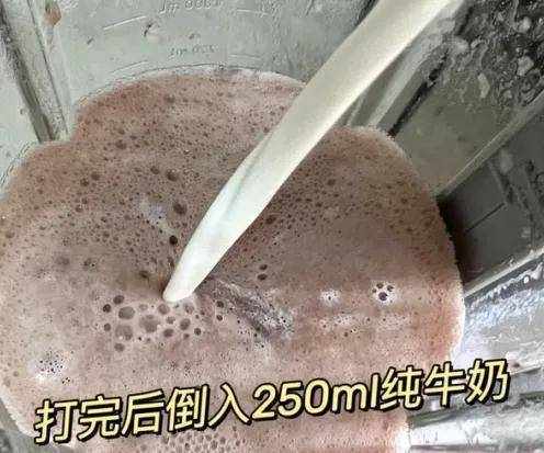 紅豆50g,糯米30g,冰糖6粒,水550ml,打好後倒入250ml純牛奶