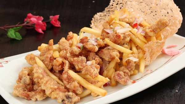 ③倒入油,油熱後夾肉條掛漿,放入油鍋中炸。
