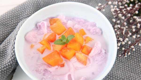 ②煮紫薯:在這段時間,我們把紫薯去皮切小塊,放到水中煮熟,加入適量的牛奶和糖。這樣一份簡簡單單的糖水就做好。