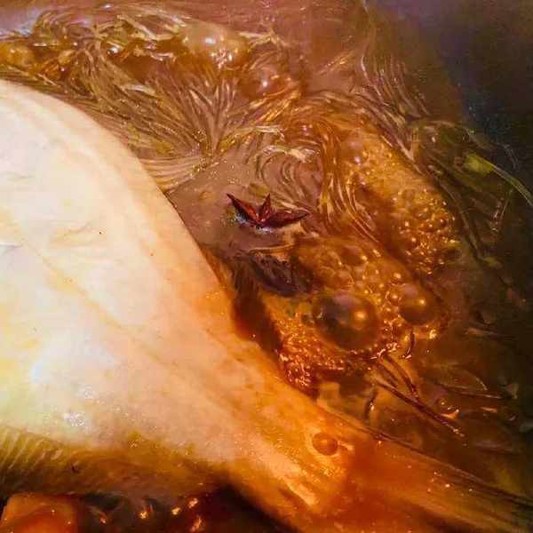 將剩餘半碗料汁澆到魚上,加清水適量,大火開燉;