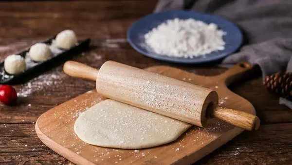 接著將醒好的面卷按扁,重復上一次的動作之後,然後蓋上保鮮膜,醒面30分鐘;最後用大拇指將面皮的中央壓扁,接著周圍的面皮用掌心壓扁,然後用搟面杖按照從中心搟向四周的方向搟,直到搟出中間厚四邊薄的面皮就可以瞭。