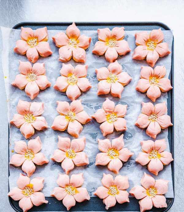 然後用小勺子把蛋黃液倒進我們剛定位好的花心位置,撒上白芝麻裝飾花蕊。