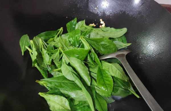 4.鍋中的蒜泥炒至微微焦黃後,將洗凈的土人參倒入油鍋中。土人參葉子含水量很高,而且很嫩,在炒的過程中要用大火快炒,經過快炒出鍋後的土人參葉子嫩滑爽口,口感更佳;