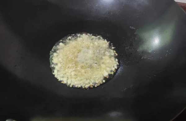 3.熱鍋中加入適量的油,鍋中的油溫熱後,將處理好的蒜苗放入油鍋中煸炒出香味。蒜泥在油鍋中煸炒,要用小火煸炒,經過煸炒後的蒜泥,味道更加鮮香美味;