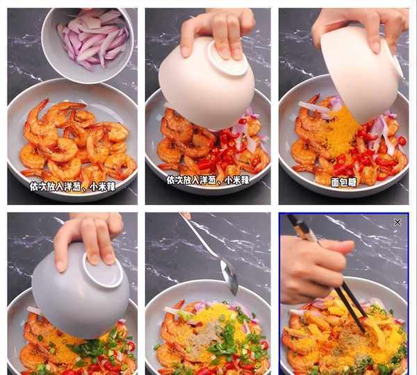 食材有:鮮蝦、面包糠、料酒、椒鹽、孜然粉、洋蔥、蔥花、小米辣。
