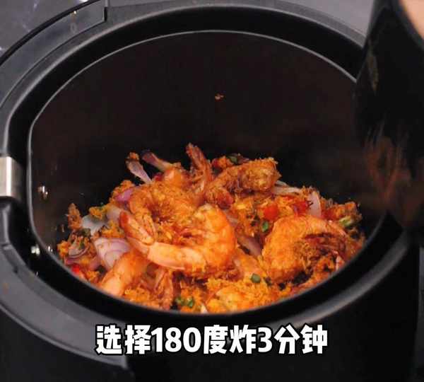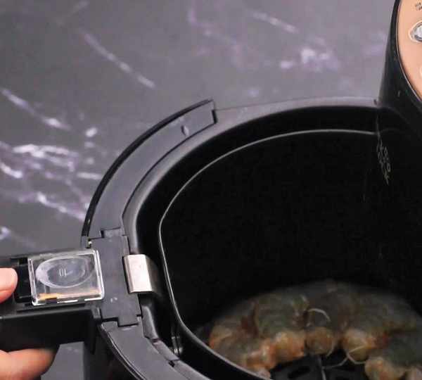 4.放入空氣炸鍋中先烤180度8分鐘。然後將蝦取出,再次放入醬料。
