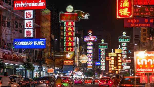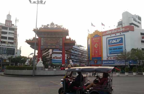 酒店的斜對面是火車站,黃大哥自豪地說,他在那片地方出生並長大。出酒店往左拐走個十幾分鐘就到瞭耀華力路,也是曼谷著名的唐人街,美食攤點主要分佈在耀華力路,在這條狹窄的道路兩邊,擺滿瞭各種大排檔,門前大多排長龍,車水馬龍,絡繹不絕。